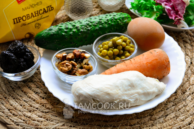 Соберите все ингредиенты для приготовления салата «Прага» с грецкими орехами. Куриное филе, яйца и морковь заранее отварите и полностью остудите.