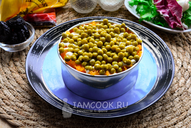 Затем идет слой из консервированного горошка. Его также полейте сеточкой из майонеза.