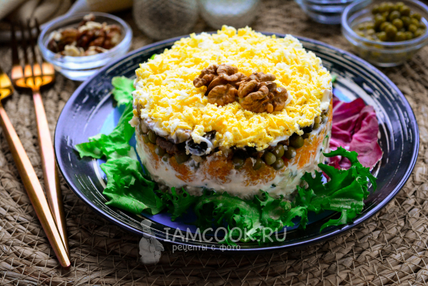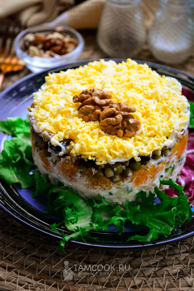 Салат «Прага» с грецкими орехами готов к дегустации.