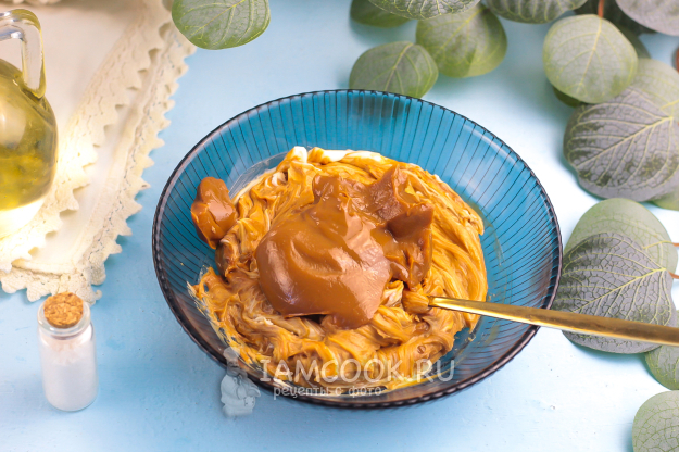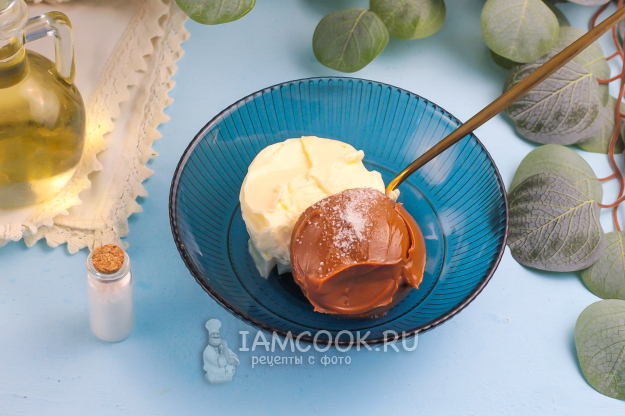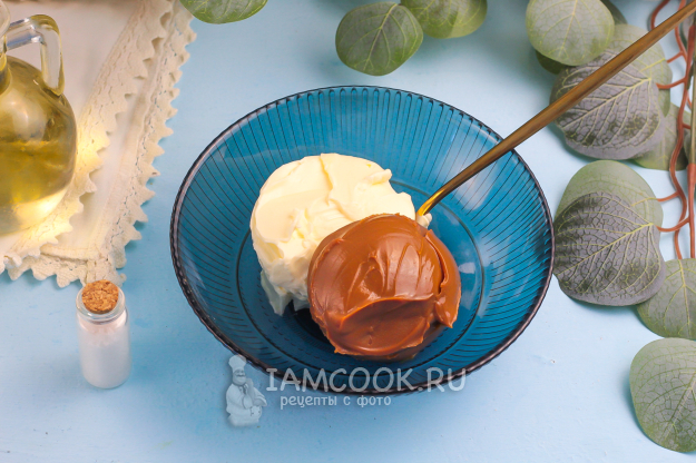 Выложите масло и половину вареного сгущенного молока в пиалу или миску.