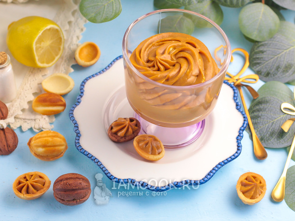 Затем выложите приготовленную начинку в кулинарный пакет и начините ею остывшие половинки печенья. По желанию начинку для печенья Орешки можно использовать в качестве крема для вафельного торта, тарталеток, трубочек и т.д. При охлаждении масса загустеет, благодаря добавленному сливочному маслу.