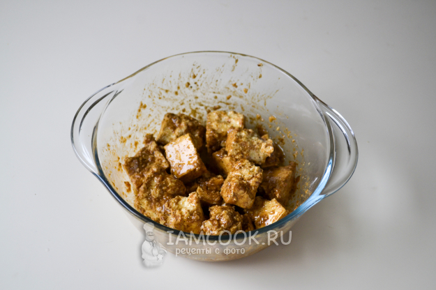Аккуратно перемешайте тофу в маринаде так, чтобы каждый кусочек со всех сторон был покрыт пикантной смесью.
