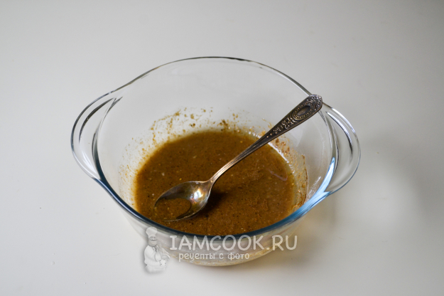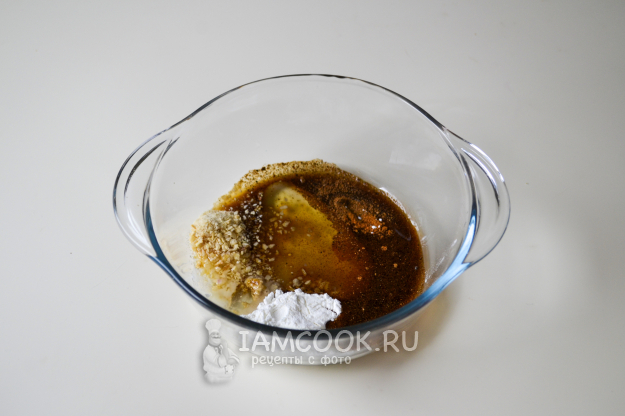 Для маринада в миску влейте соевый соус, растительное масло, положите копченую паприку, смесь перцев, крахмал. Для большего вкуса я добавила сушеный лук.