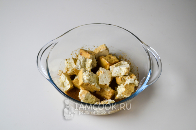 Обсушенный тофу поломайте на кусочки со стороной примерно 2 см.