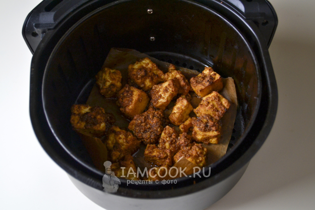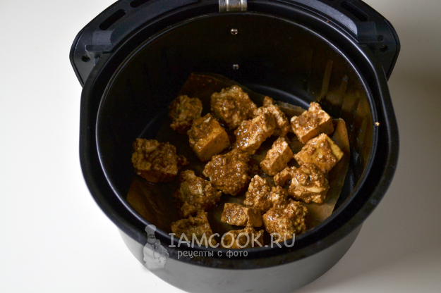 Разложите кусочки тофу в чашу аэрогриля в один слой. Хорошо, если между кусочками будет небольшое расстояние - так тофу равномерно запечется. Запекайте сыр тофу в аэрогриле при температуре 180-190°С примерно 15 минут.