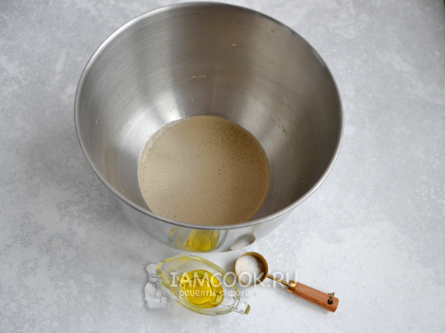 В миску для замешивания теста влейте воду комнатной температуры, всыпьте сухие дрожжи, соль, добавьте оливковое масло, все смешайте до растворения дрожжей.
