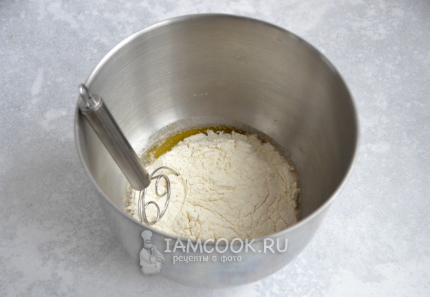 Всыпьте муку, руками или миксером замесите тесто. Тесто вымешивайте не менее 7-10 минут, оно не должно прилипать к рукам.