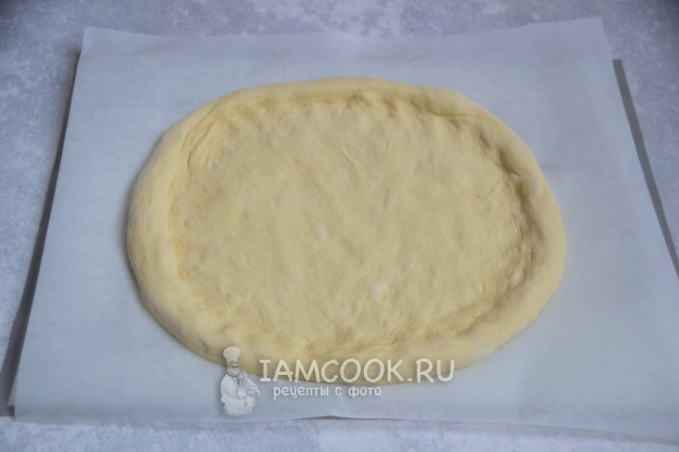 Выложите тесто на лист для выпечки, руками растяните тесто в круг, оставьте бортики.