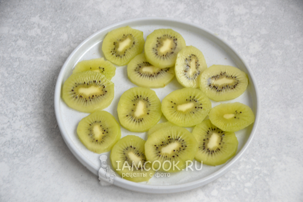 Очистите киви, нарежьте на ломтики толщиной 3-5 мм.