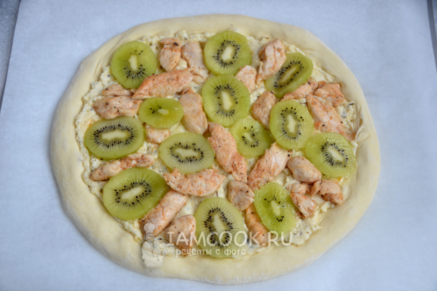 Выложите на соус обжаренное куриное филе и ломтики киви.