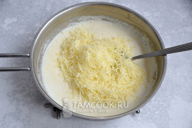 Добавьте в массу тертый сыр, при этом оставьте немного сыра для посыпки перед выпечкой, вмешайте сыр в массу.