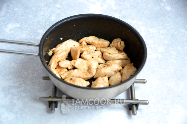 Филе куриной грудки нарежьте на кусочки, обжарьте на растительном масле, посолите, поперчите по вкусу, можно добавить при обжаривании сухой чеснок, паприку.