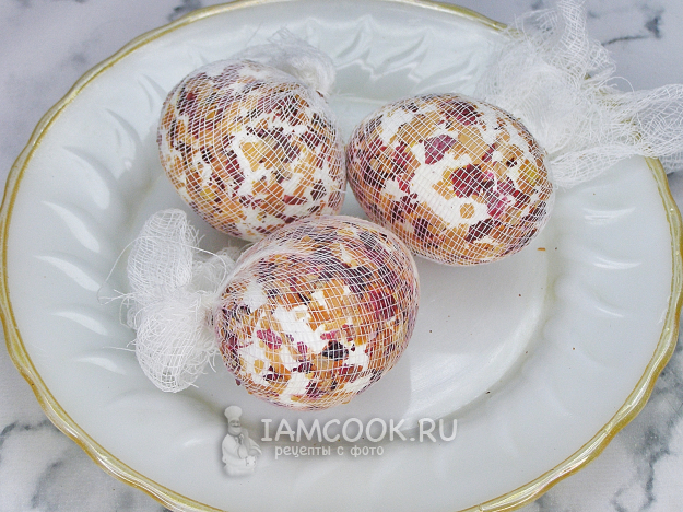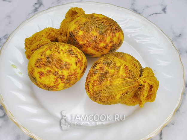Когда пройдёт время, достаём яйца из раствора, аккуратно ножницами срезаем марлю.