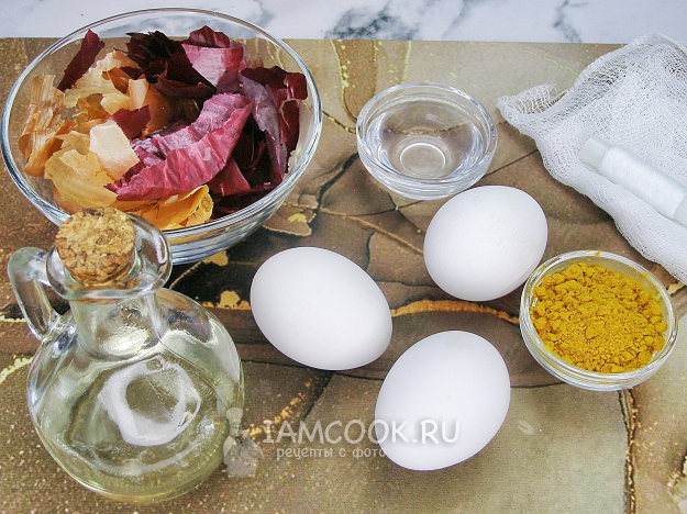 Соберём необходимые ингредиенты для приготовления мраморных яиц с куркумой на Пасху. Чтобы скорлупа не треснула при варке, достаньте яйца из холодильника заранее - они должны согреться до комнатной температуры. Лучше всего подойдут белые или светло-бежевые яйца. Для создания глубокого рисунка смешайте шелуху обычного репчатого и красного лука. Также подготовьте марлевые квадраты размером 15х15 см и нитки.