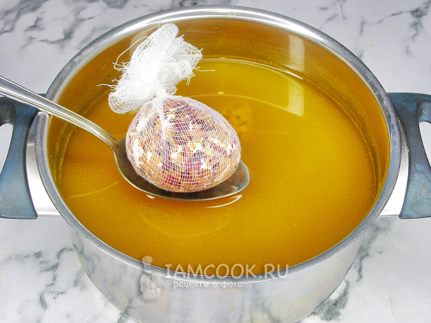 Яйцо моем и, не вытирая, обваливаем в луковой шелухе, затем кладём его на марлевый отрез.