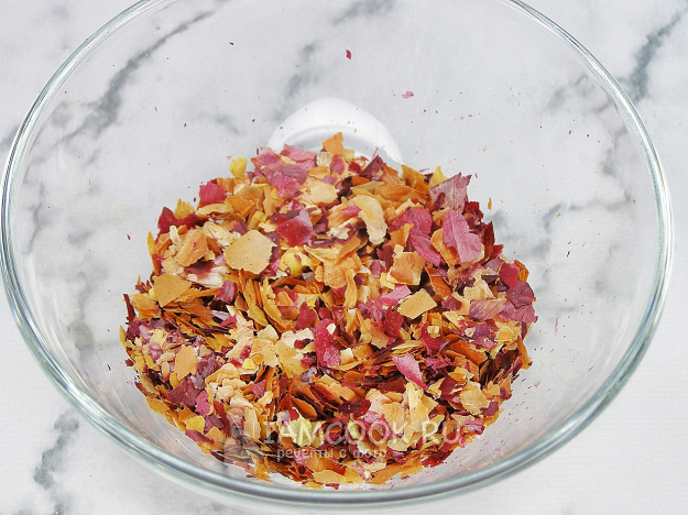Луковую шелуху измельчаем любым удобным способом - можно нарезать ножницами, но удобнее измельчить в блендере. Кусочки шелухи должны получиться мелкими, примерно по 0,5 см.