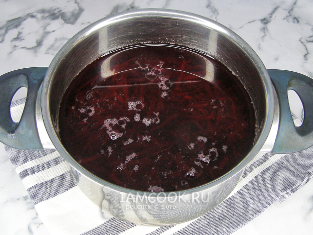 Перекладываем натёртую свеклу в кастрюлю, вливаем холодную воду.