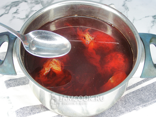 Снимаем кастрюлю с огня, добавляем уксус, перемешиваем и оставляем остывать. Я красила яйца 2 часа, поэтому они получились бледно-розовыми, но если подержать их в воде подольше, например, оставить на ночь, то цвет будет ярче.
