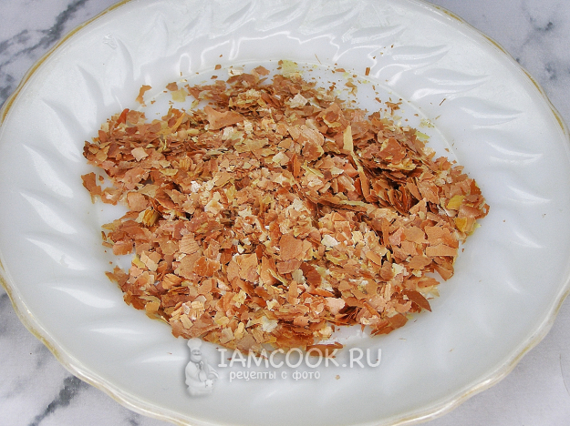 Измельчаем луковую шелуху. Её можно размять руками, нарезать ножницами или пробить блендером. Кусочки шелухи лучше сделать мелкими, так рисунок получится интереснее.