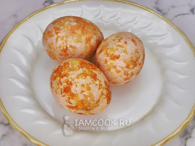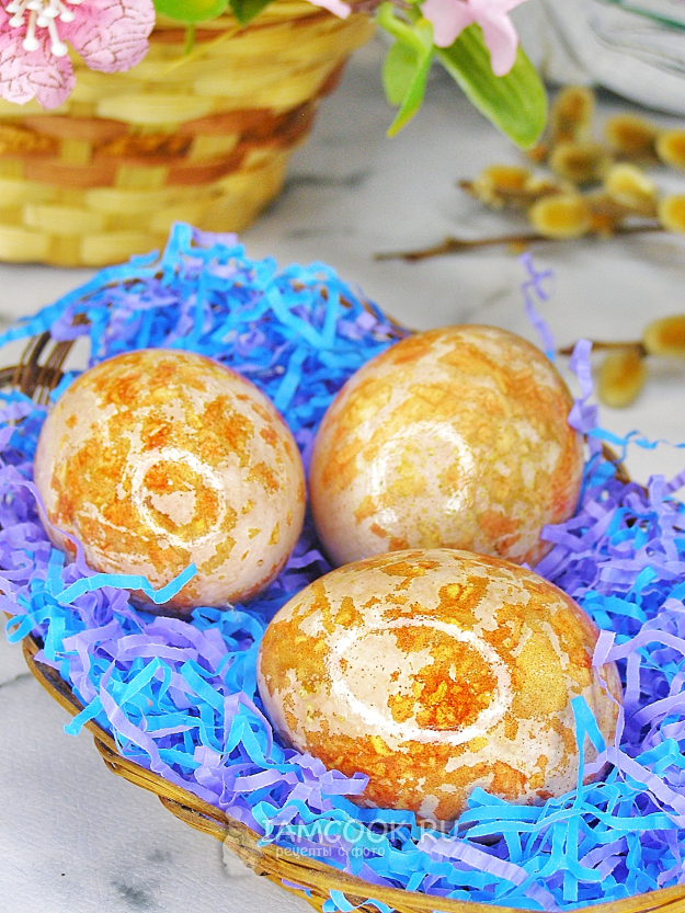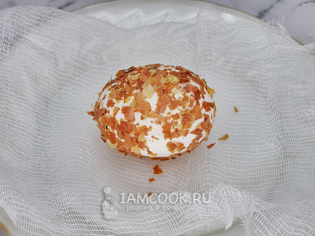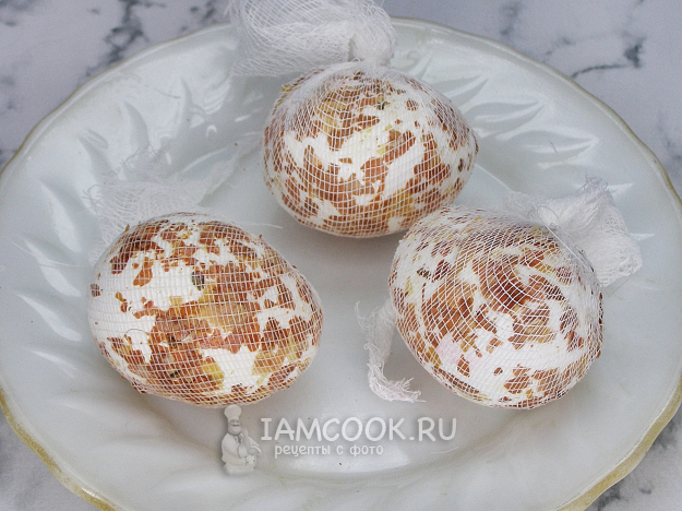 Аккуратно срезаем марлю, яйца ополаскиваем прохладной водой, смываем шелуху и просушиваем бумажными салфетками.