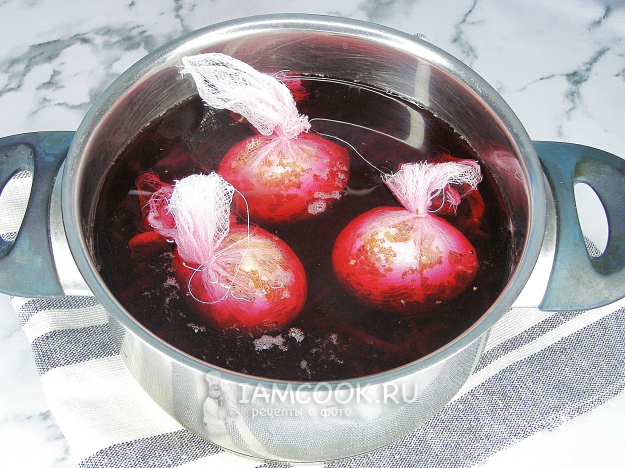 Ещё, помимо прочих ингредиентов, вам понадобится несколько кусков марли размером примерно 15х15 см, соответственно количеству яиц, и достаточно прочные нитки, чтобы не порвались во время варки.
