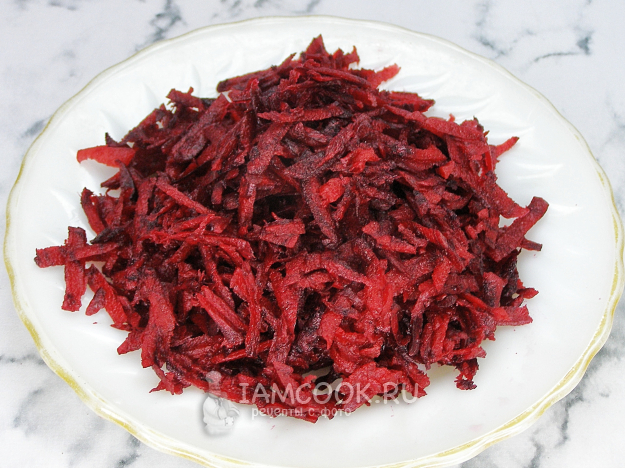 Свеклу хорошо моем, очищаем от кожицы и натираем на крупной тёрке.