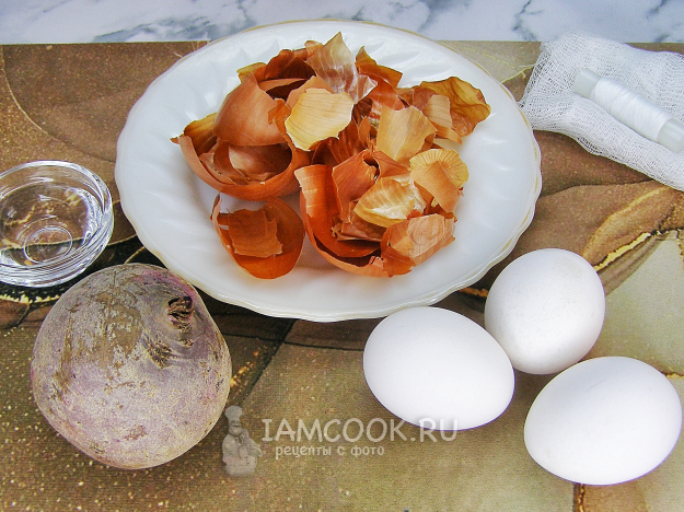 Соберём продукты для приготовления мраморных яиц в свекле на Пасху. Яйца лучше взять белые, а примерно за час до начала приготовления их нужно достать из холодильника, чтобы они согрелись (так они не потрескаются во время варки).