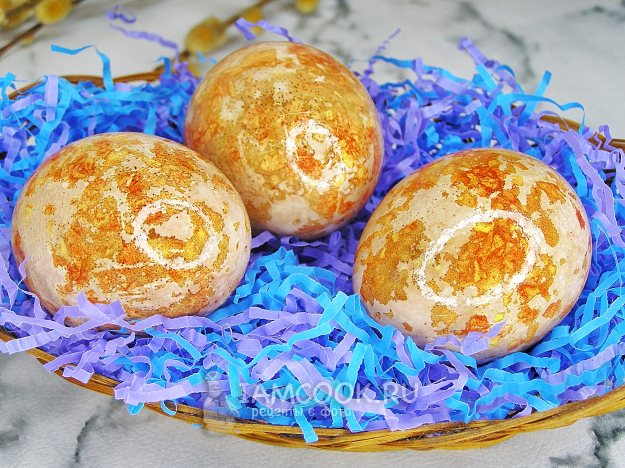 Яйца тщательно моем в чуть тёплой воде. Мокрое яйцо обваливаем в измельчённой луковой шелухе, но не полностью, а так, чтобы остались пустые места. Перекладываем на отрез марли.