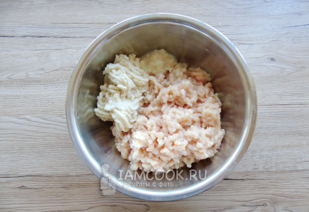 Белый батон залейте холодной кипяченой водой и через несколько минут отожмите. Пропустите через мясорубку куриное филе, лук, чеснок и батон.