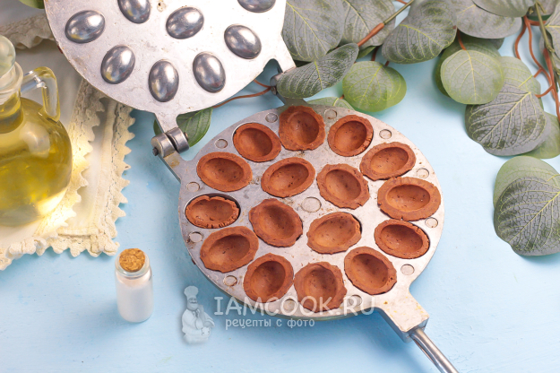 Разогрейте орешницу и смажьте ее панели растительным маслом. Выложите в каждое отверстие по колобку теста и испеките по 2-3 минуты. Помните, что форму нужно переворачивать, тогда как в электрической орешнице печенье выпекается с обеих сторон.