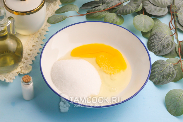 Вбейте куриное яйцо в глубокую емкость: миску или салатник. Всыпьте туда же соль и сахар, взбейте 2-3 минуты венчиком.
