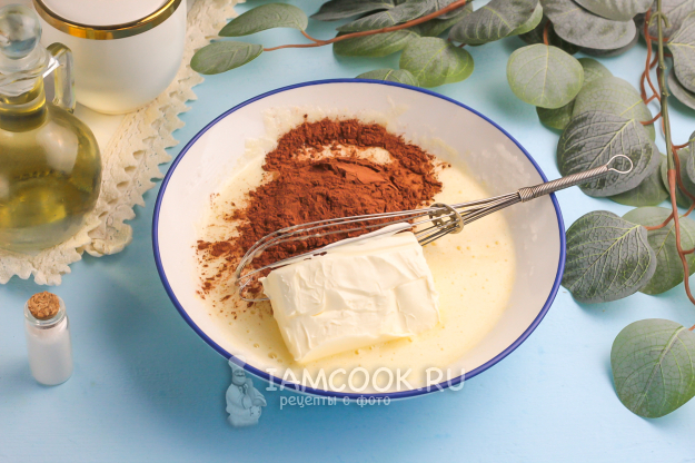 Выложите сливочное масло в емкость и всыпьте какао-порошок. Он отлично растворяется в жирной или горячей массе, так как в нем также присутствует масло. Тщательно вымешайте всю массу в течение 4-5 минут.
