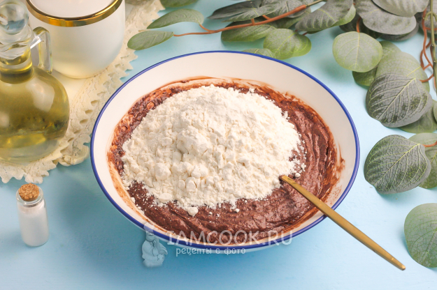 Всыпьте частями пшеничную муку высшего сорта и разрыхлитель. Вмешайте их в шоколадную массу.