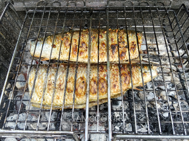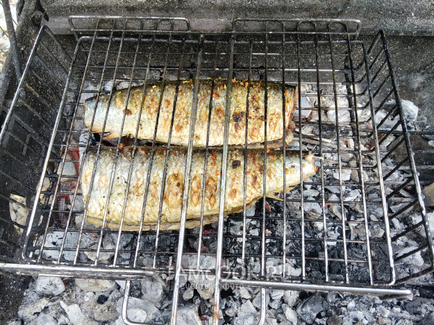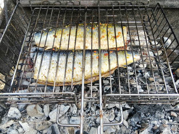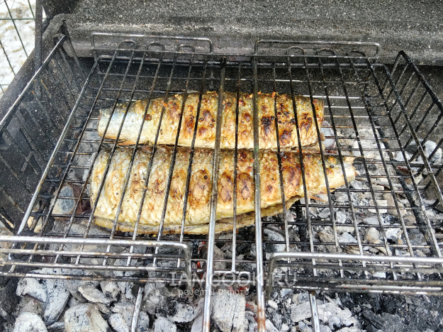 Рыбу зажать в решетке, поставить на мангал с седыми углями, сильный жар не нужен.