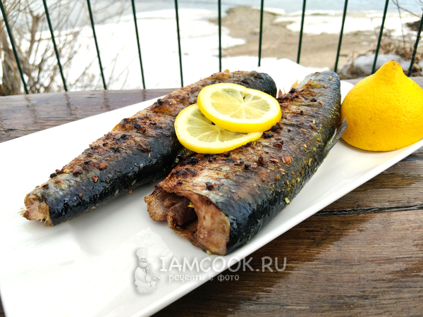Селедка на мангале на решетке получилась румяной и аппетитной, подавать её лучше с лимоном.