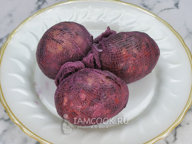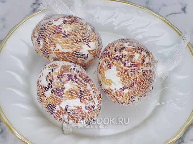 По истечении времени достаём яйца из отвара, аккуратно срезаем марлю.