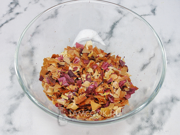 Луковую шелуху измельчаем любым удобным способом - ножницами или с помощью блендера. Должны получиться маленькие кусочки.
