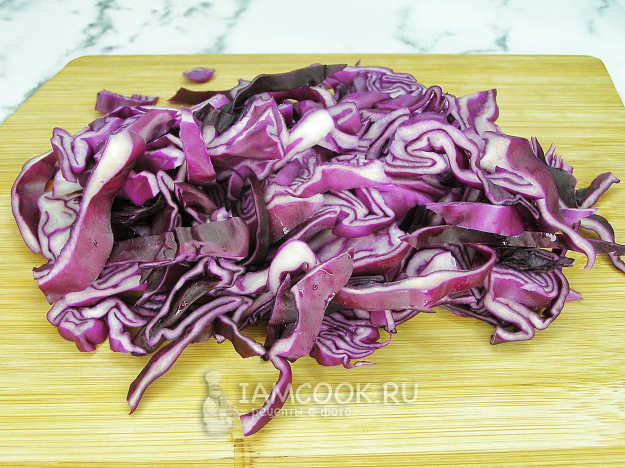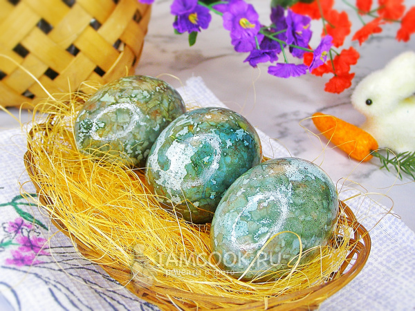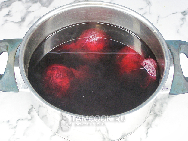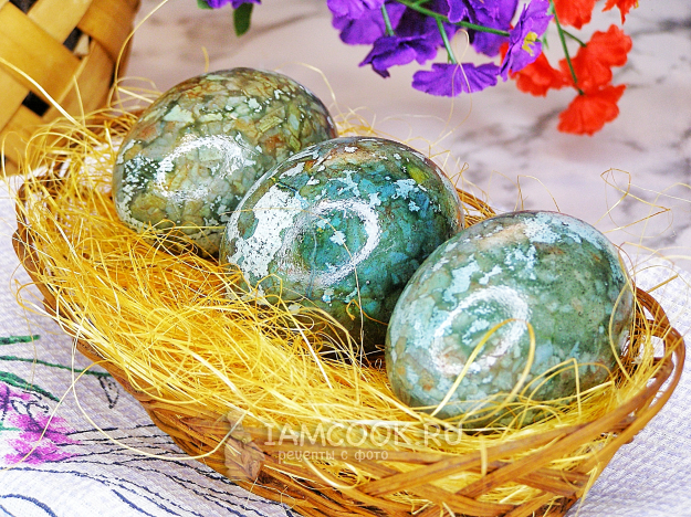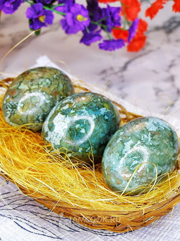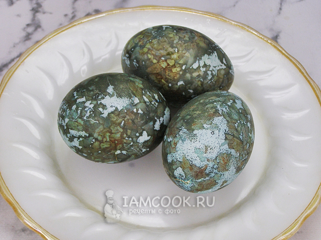 Для придания блеска смазываем яйца растительным маслом. Мраморные яйца с краснокочанной капустой готовы.