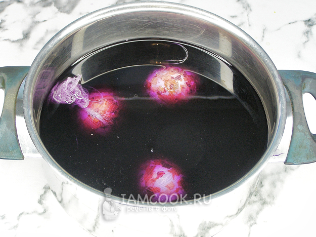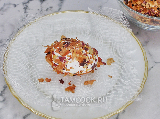 Яйца тщательно моем тёплой водой, затем мокрое яйцо обваливаем в луковой шелухе. Лучше обвалять яйцо не полностью, а так, чтобы остались свободные от шелухи места.