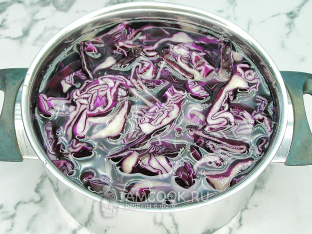 Перекладываем капусту в кастрюлю, заливаем холодной водой и ставим на сильный огонь. Доводим до кипения, затем уменьшаем огонь и варим примерно 30 минут.