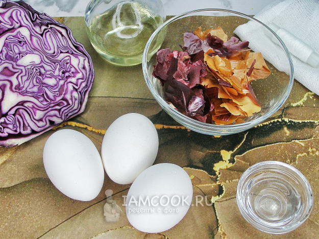 Соберём ингредиенты для приготовления мраморных яиц с краснокочанной капустой на Пасху. Луковую шелуху можно взять и от репчатого, и от красного лука, так рисунок получится интереснее. Яйца нужно заранее достать из холодильника, чтобы они прогрелись до комнатной температуры.