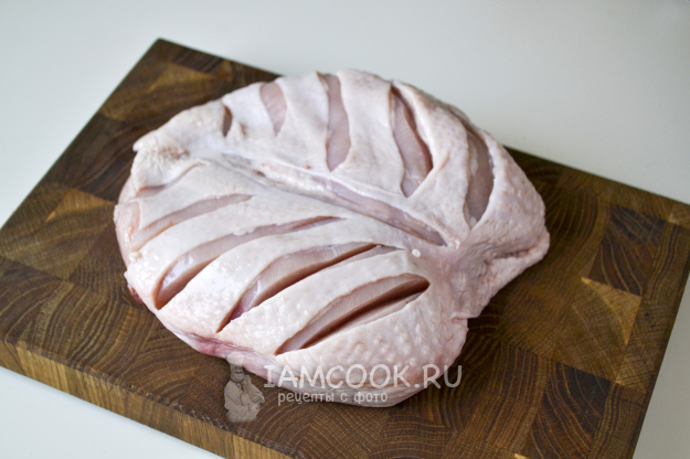 Куриную грудку вымойте, обсушите. Разложите грудку на доске и сделайте острым ножом глубокие надрезы, как на фото.
