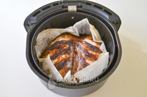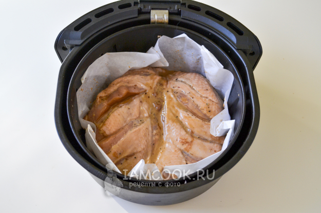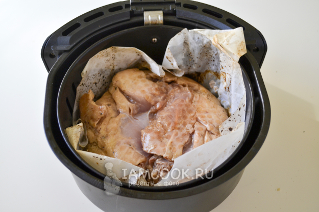 Чашу аэрогриля застелите пекарской бумагой, положите маринованную куриную грудку кожей вверх. Установите время приготовления 30-35 минут, температуру 190°С.