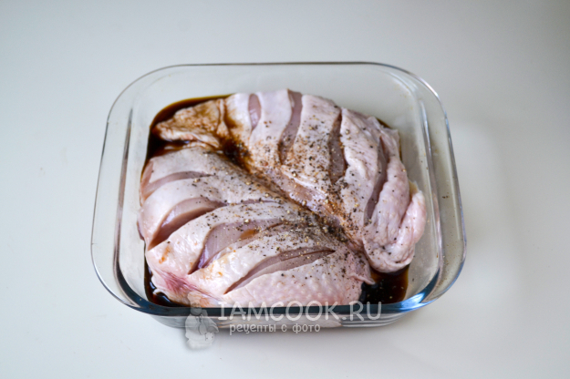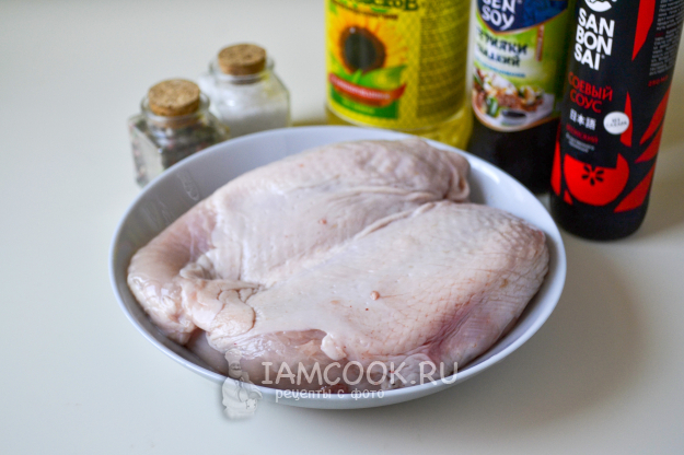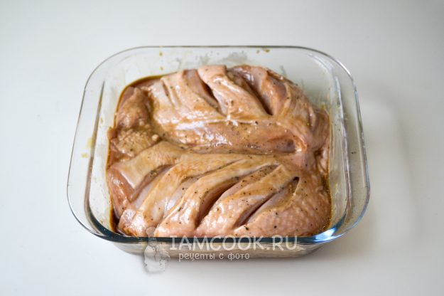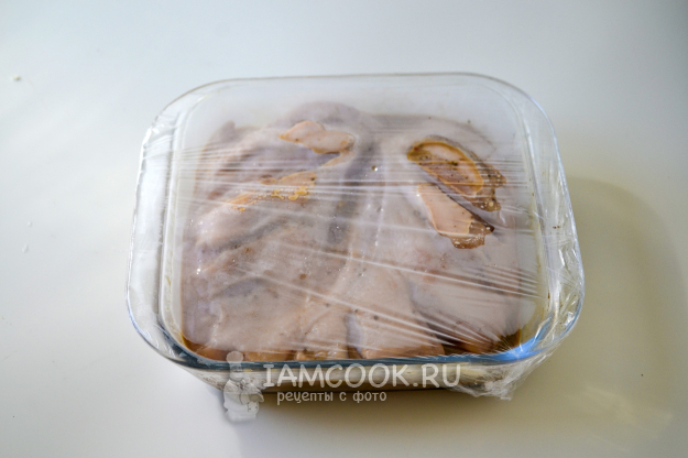 Затяните посуду пищевой пленкой и поставьте в холодильник минимум на 2 часа. Если время позволяет, то можно оставить грудку мариноваться на всю ночь.