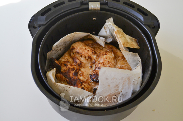 Продолжайте запекать маринованную куриную грудку в аэрогриле еще примерно 15 минут. Смотрите по результату. По истечении этого времени сделайте на мясе разрез - если мясо светлое, без крови, и выделяется прозрачный сок, значит оно готово. В противном случае продолжайте запекать еще несколько минут.