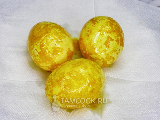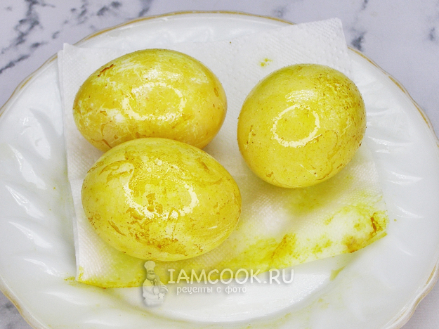 Высохшие яйца аккуратно протираем ватным диском с растительным маслом, чтобы убрать лишний порошок куркумы и придать им блеск.