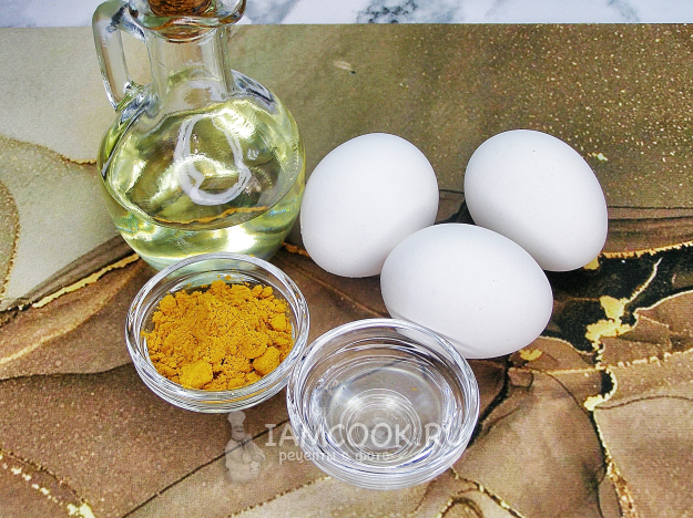 Соберём ингредиенты для приготовления крашеных яиц в куркуме и растительном масле. Яйца желательно заранее достать из холодильника, чтобы они согрелись - это нужно, чтобы они не лопнули во время варки.