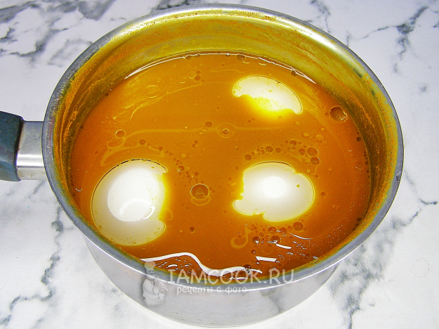 Яйца отвариваем на среднем огне 8-10 минут после закипания, затем опускаем в холодную воду, чтобы они остыли. Яйца можно отварить и заранее, главное, чтобы они были холодными. Вытираем яйца насухо (это обязательно!) и кладём в раствор куркумы с маслом. Оставляем на 30-60 секунд, медленно прокручиваем ложкой и перекладываем на салфетку. Дольше не держите, так как яйца окрасятся равномерно (нам же не это нужно).
