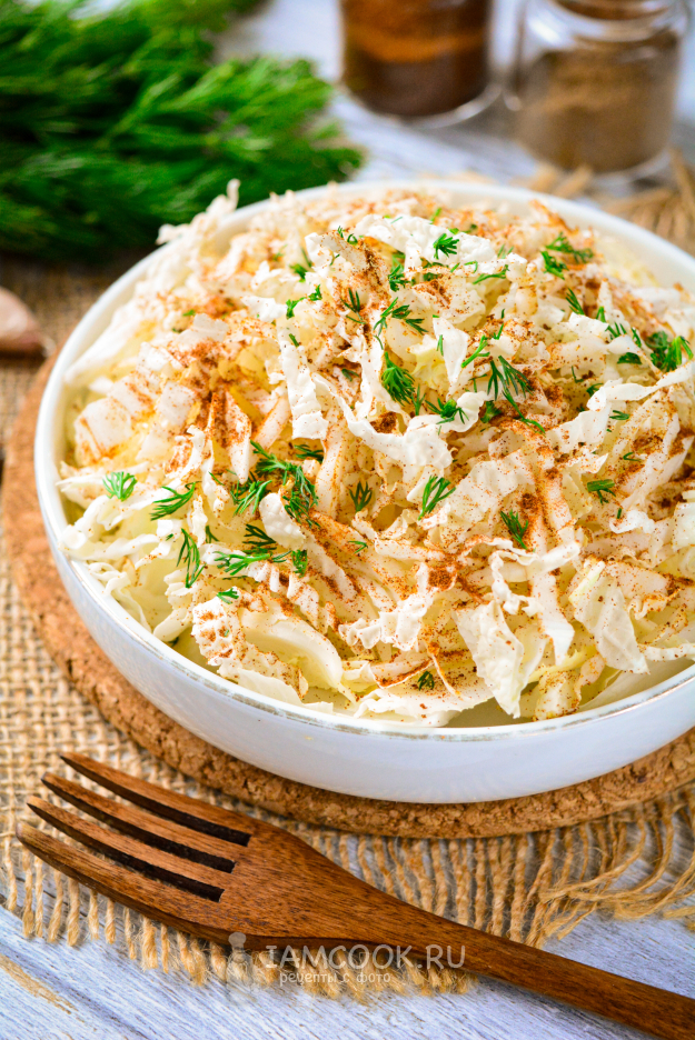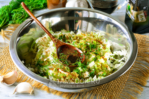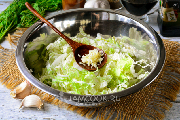 Капусту выложите в подходящую миску, выдавите туда же чеснок через пресс. Чем больше чеснока, тем более острым получится салат.