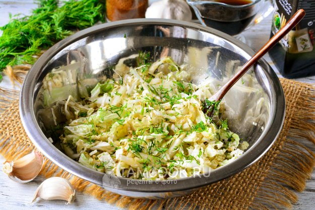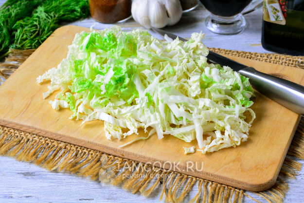 Пекинскую капусту сполосните, нашинкуйте тонкими полосками.
